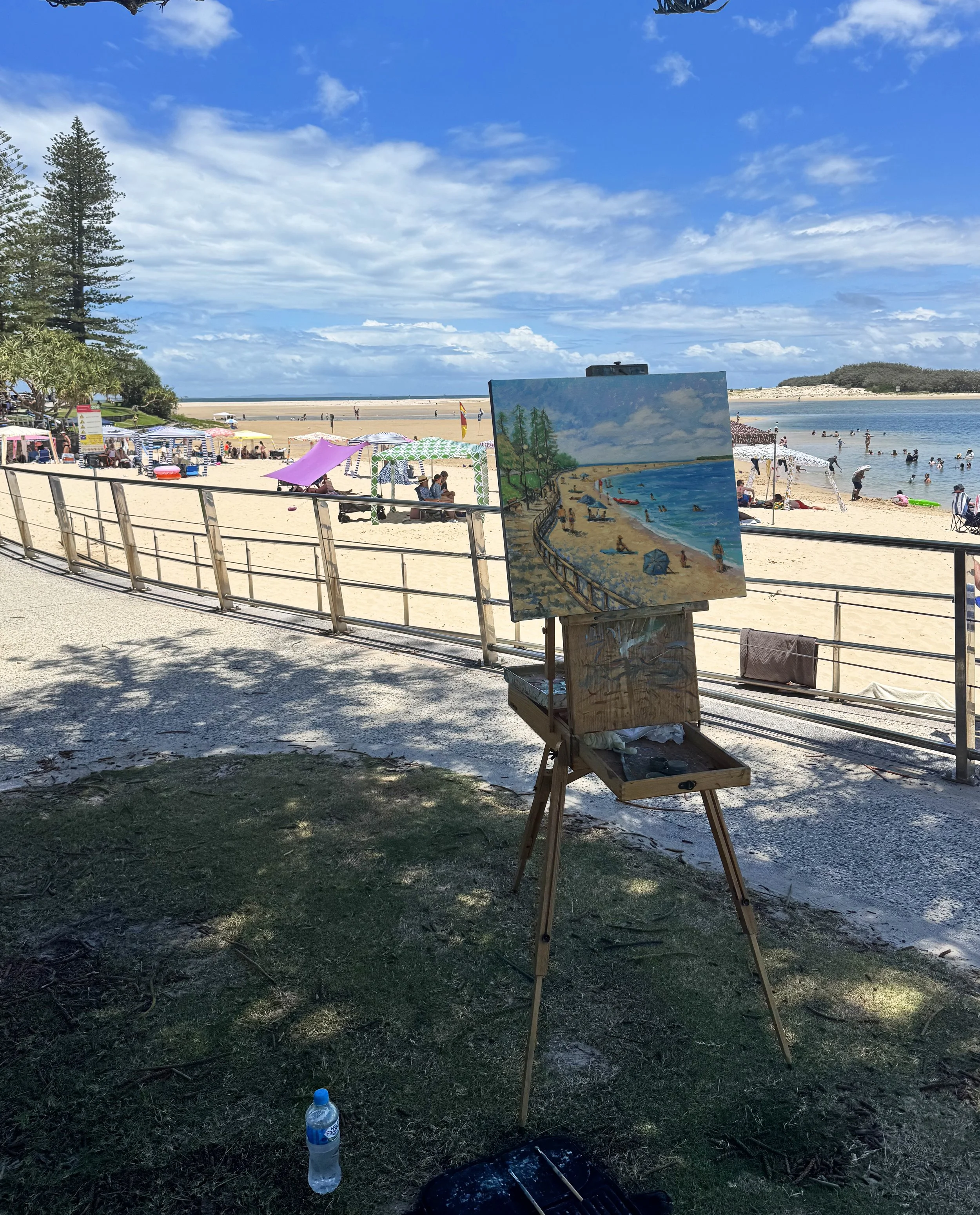 Happy New Year, everyone! As I embark on my first blog entry of the year, I find myself reflecting on the beautiful transition from one year to the next. The location I chose for my first painting of the year, Bulcock Beach, is a great representation for the transitions of time. This iconic landmark on the Sunshine Coast is known for its vibrant atmosphere, breathtaking views, and special place in the hearts of local families and communities. Over the years, Bulcock Beach has undergone significant changes, shaped by the relentless forces of nature. Cyclones are common on the Sunshine Coast and have sculpted the landscape, closing what was once an open channel to the sea and creating a serene bay-like area. This evolution not only altered the physical appearance of the beach but also symbolizes the beauty of change—a perfect metaphor as we step into a new year. For me, as a painter, these changes present a unique opportunity to capture the essence of Bulcock Beach, allowing me to immortalize the beauty of its transformation into how it appears today.